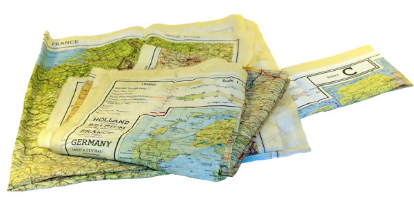 ‘Sjaalkaart’ met daarop het gebied waarover ze met hun vliegtuig vlogen. De kaart was gedrukt op zijde, zodat bij een ongeval waterschade de kaart niet onbruikbaar maakte.