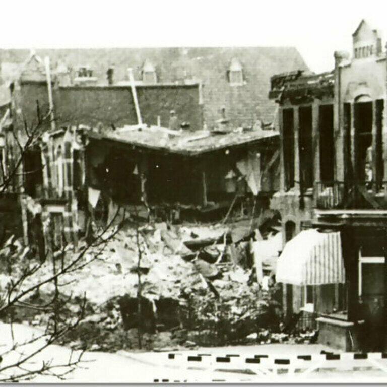 Bomschade Wybrand de Geeststraat, Leeuwarden 23 maart 1944, na mislukt bombardement vliegveld.