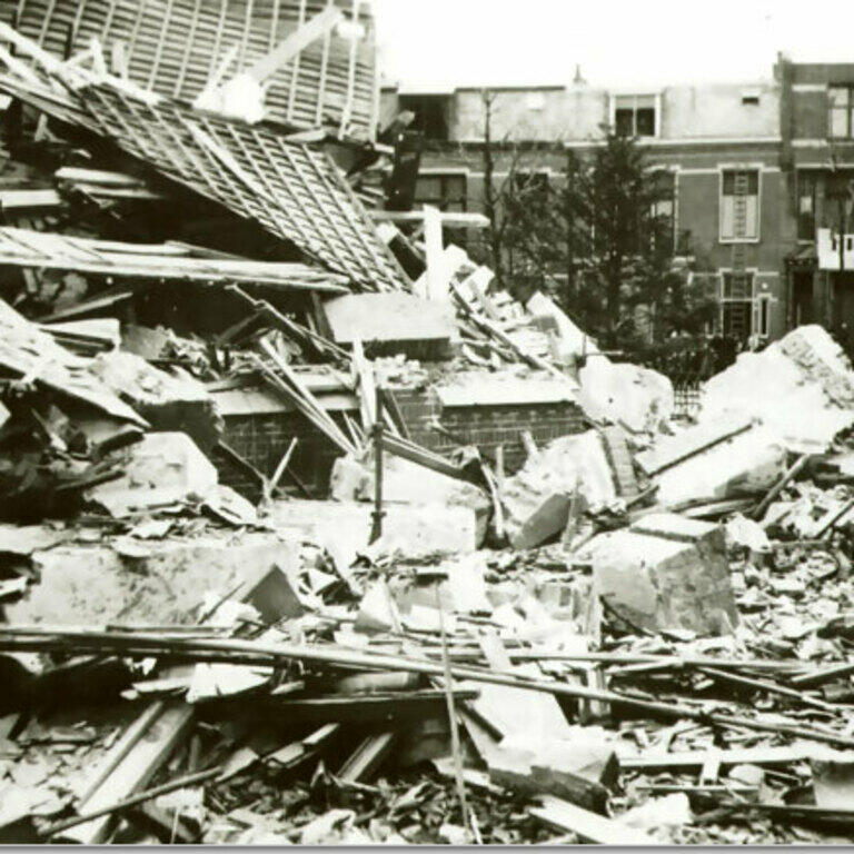 Bomschade Ambachtschool, Leeuwarden, 23 maart 1944, na mislukt bombardement vliegveld.