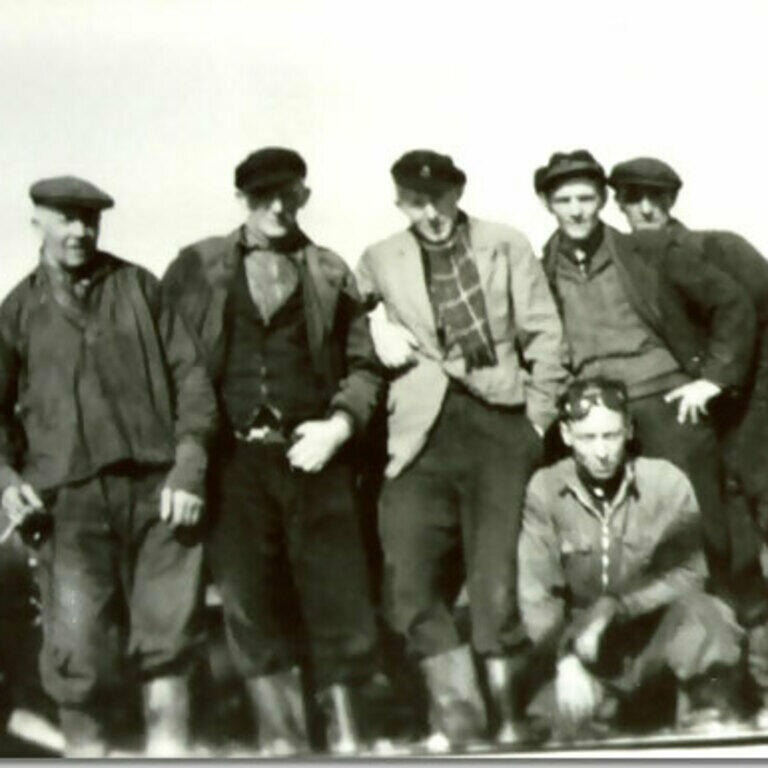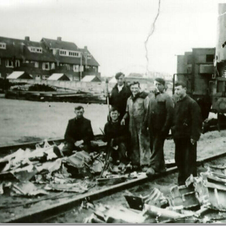 Werknemers van het Zerlege Betrieb in Utrecht waar tijdens de bezettingsjaren de restanten van neergestorte vliegtuigen naar toe werden gebracht om te worden ontmanteld. Waardevolle schaarse materialen werden naar Duitsland afgevoerd en daar hergebruikt. Collectie H. Wilson, Bilthoven.