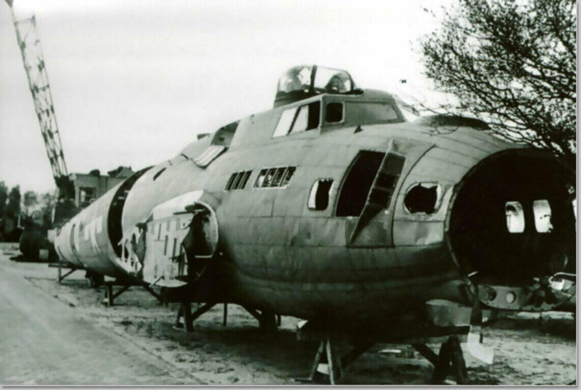 Wrak van een B-17 Flying Fortress wachtend op de sloop in Vught.