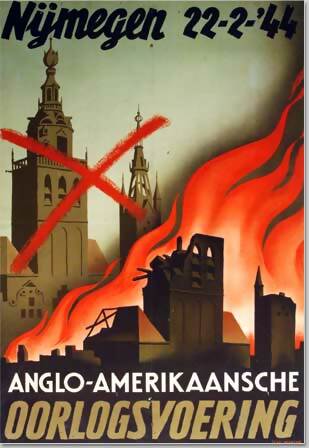 Foto: antigeallieerde affiche verwijzend naar het geallieerde (vergissings)bombardement op Nijmegen 22 februari 1944.