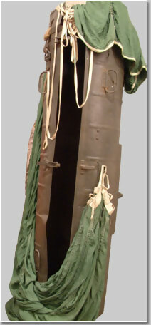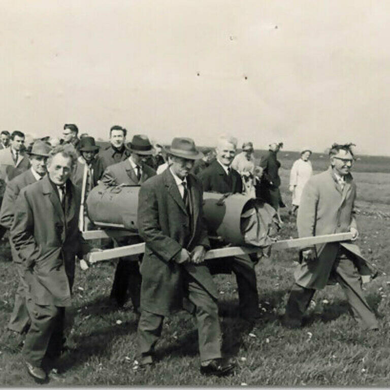 De lûken steane wiid iepen. En wylst de Halifax in moaie dûk nei ûnderen makket, falt de iene kontainer nei de oare nei buten ta. De reade, wite, griene en brune parasjutes teare iepen. Efkes letter falle der in lytse tritich kontainers mei wapens op Fryske grûn!