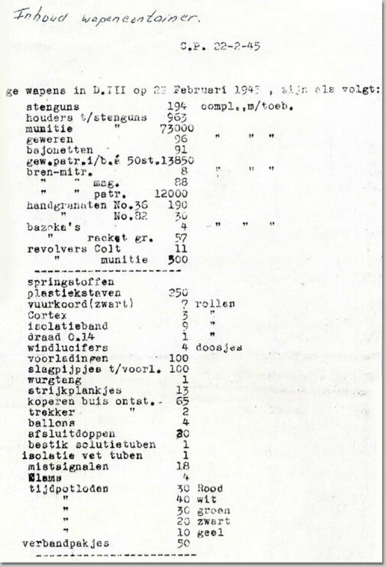 De eerste keer wisten we niet precies hoe het zou gaan. Wij dachten dat er een kist uit het vliegtuig gegooid zou worden en hadden het er nog over, dat we die niet op onze kop moesten krijgen. Toen verscheen in de verte het vliegtuig. Met rode en witte lampen die alleen omhoog schenen en een seinlamp gaven we het droppingsveld aan. Met veel lawaai kwamen er toen allemaal containers aan parachutes uit het vliegtuig.